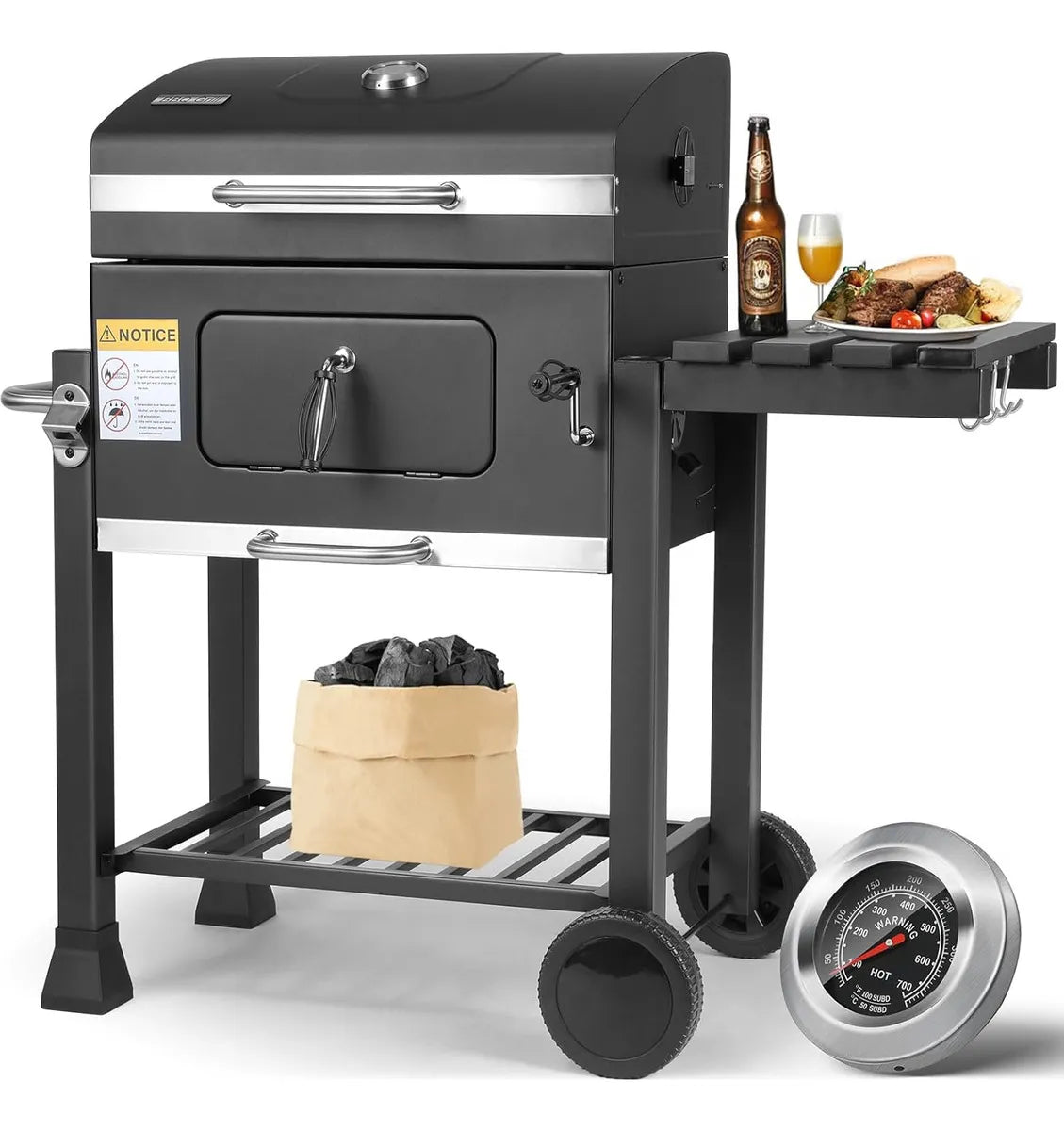 Parrilla Portátil Asador con Tapa y Ruedas - SKU: PAR61 Características: • Parrilla premium de acero inoxidable portátil con ruedas y manija • Apta carbón o leña • Medidor de temperatura • Cajón de cenizas con manija • Apoya bandeja con tapa cobertora • Doble asador • Bandeja Ajustable para acercar la llama • Mangos de acero inoxidable • Aparador de acero Plegable • 4 aperturas para regular aire • Accesorio abre cervezas • Mesa lateral con ganchos • Medidas: 115 x 60 x 108 cm • Área de asador: 55 x 41 cm • Color: Negro • Peso 28 Kg